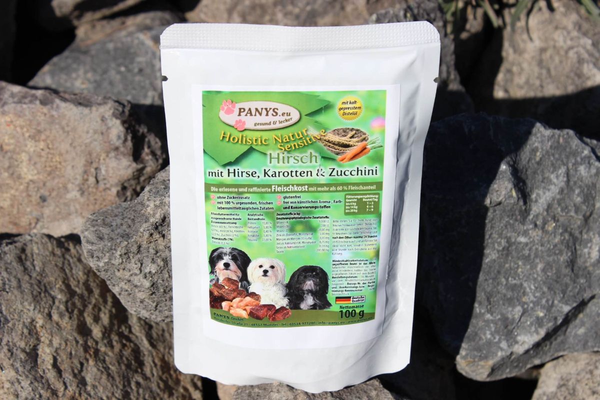Alle PANYS Menüs im Pouchbeutel gibt es in 100 g und 300 g und sind als Alleinfuttermittel für ausgewachsene Hunde zugelassen. Mit wenigstens 60,0 % Fleischanteil und ohne Zuckerzusatz, sind es ernährungsphysiologisch ausgewogene Rezepturen.