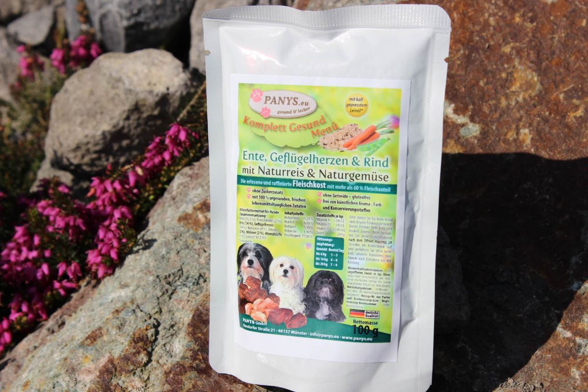 Alle PANYS Menüs im Pouchbeutel gibt es in 100 g und 300 g und sind als Alleinfuttermittel für ausgewachsene Hunde zugelassen. Mit wenigstens 60,0 % Fleischanteil und ohne Zuckerzusatz, sind es ernährungsphysiologisch ausgewogene Rezepturen.